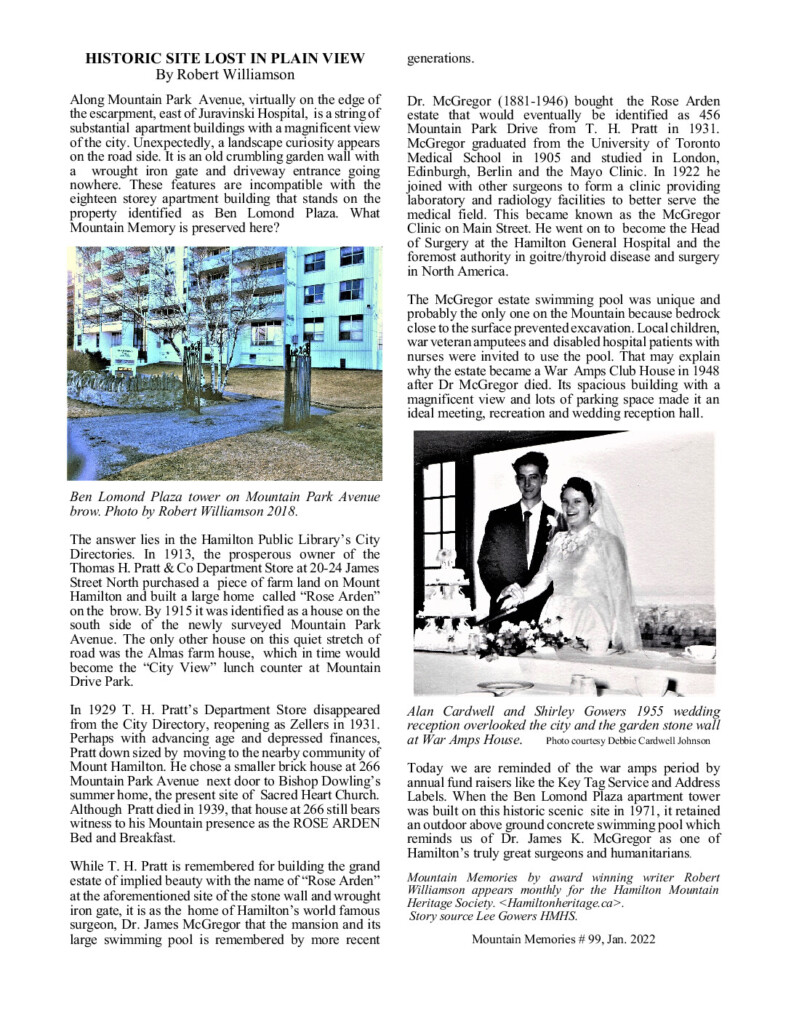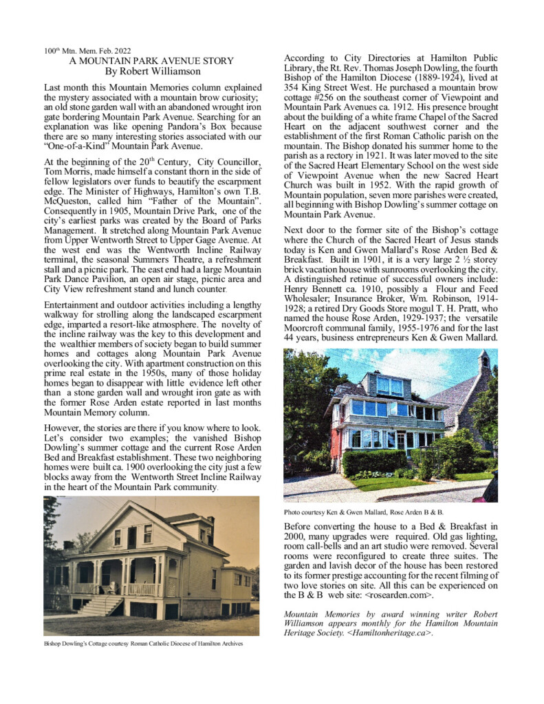 Along Mountain Park Avenue, virtually on the edge of the escarpment, east of Juravinski Hospital, is a string of substantial apartment buildings with a magnificent view of the city. Unexpectedly, a landscape curiosity appears on the road side. It is an old crumbling garden wall with a wrought iron gate and driveway entrance going nowhere. …