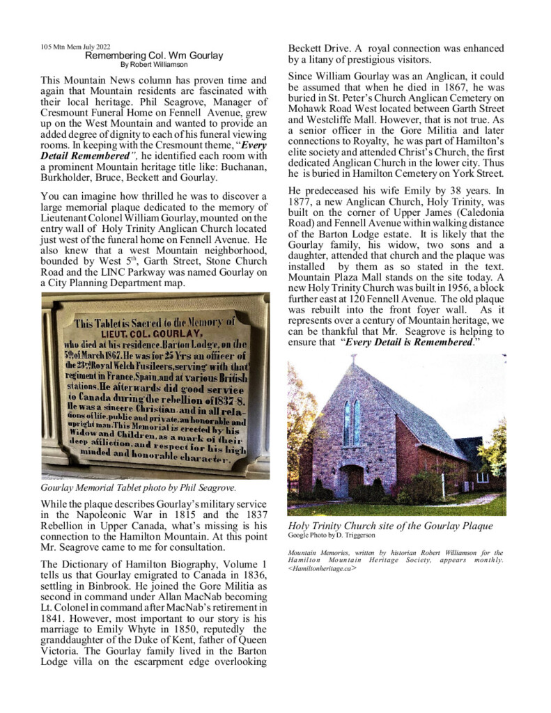 The Dictionary of Hamilton Biography, Volume 1 tells us that Gourlay emigrated to Canada in 1836, settling in Binbrook. He joined the Gore Militia as second in command under Allan MacNab becoming Lt. Colonel in command after MacNab’s retirement in 1841. …