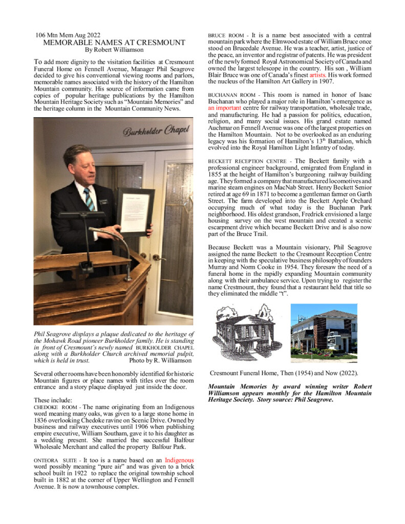 To add more dignity to the visitation facilities at Cresmount Funeral Home on Fennell Avenue, Manager Phil Seagrove decided to give his conventional viewing rooms and parlors, memorable names associated with the history of the Hamilton Mountain community…
