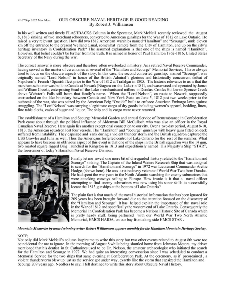 On Tuesday, August 8, a Naval Memorial Service was held at 7:00 p.m. at Confederation Park for the 1813 sinking of the “Hamilton and Scourge”, two merchant schooners converted to American gun ships, the latter formerly the British ship Lord Nelson…..