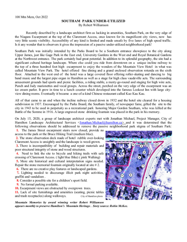 Recently described by a landscape architect firm as lacking in amenities, Southam Park, on the very edge of the Niagara Escarpment at the top of the Claremont Access, once known for its magnificent city views, now has very little scenic visibility. Accessibility of any kind is limited and made unsafe by five lanes of high speed traffic. Is it any wonder that to observers it gives the impression of a passive under-utilized neighborhood park! …