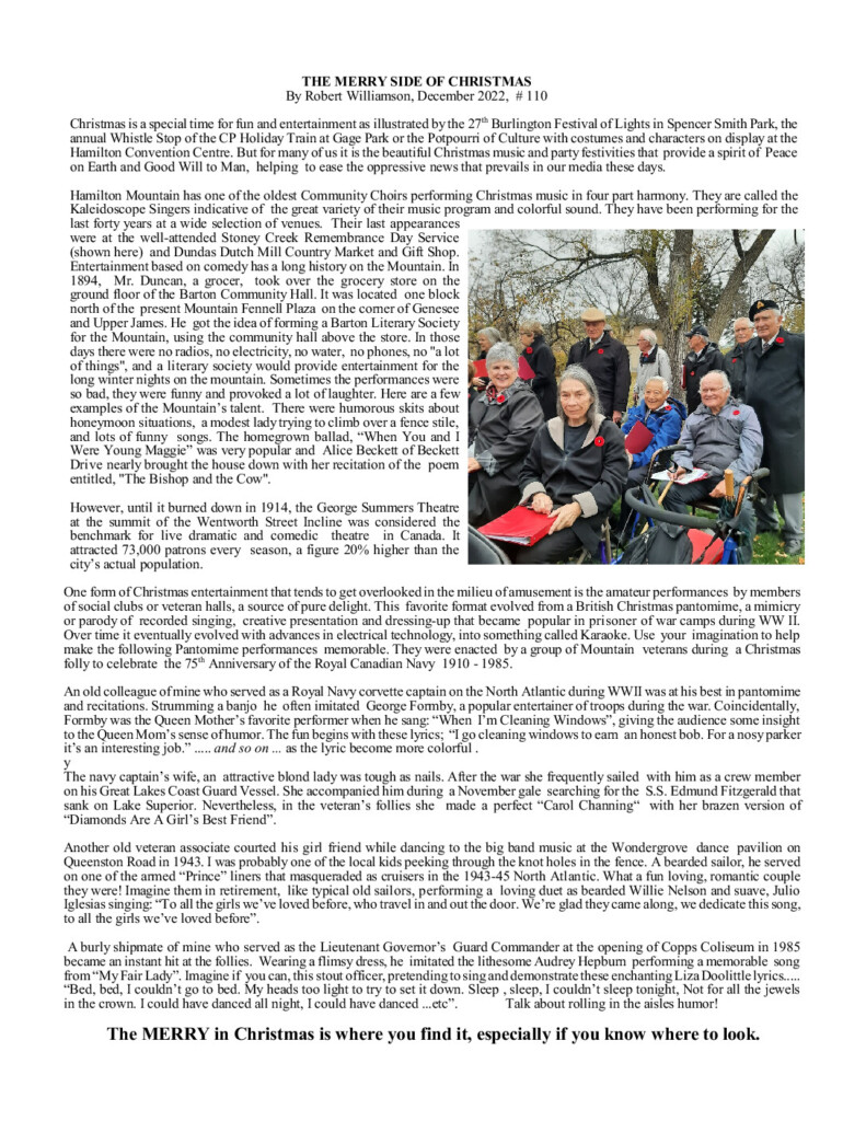 Hamilton Mountain has one of the oldest Community Choirs performing Christmas music in four part harmony. They are called the Kaleidoscope Singers indicative of the great variety of their music program and colorful sound. They have been performing for the last forty years at a wide selection of venues. …