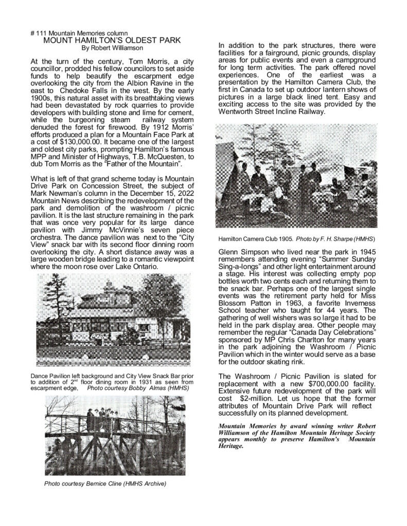 At the turn of the century, Tom Morris, a city councillor, prodded his fellow councilors to set aside funds to help beautify the escarpment edge overlooking the city from the Albion Ravine in the east to Chedoke Falls in the west…