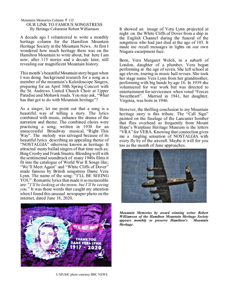 This month’s beautiful Mountain story began when I was doing background research for a song as a member of the mountain’s Kaleidoscope Singers, preparing for an April 30th Spring Concert with the St. Andrews United Church Choir at Upper Paradise and Mohawk roads. You may ask, “What has that got to do with Mountain heritage”? …