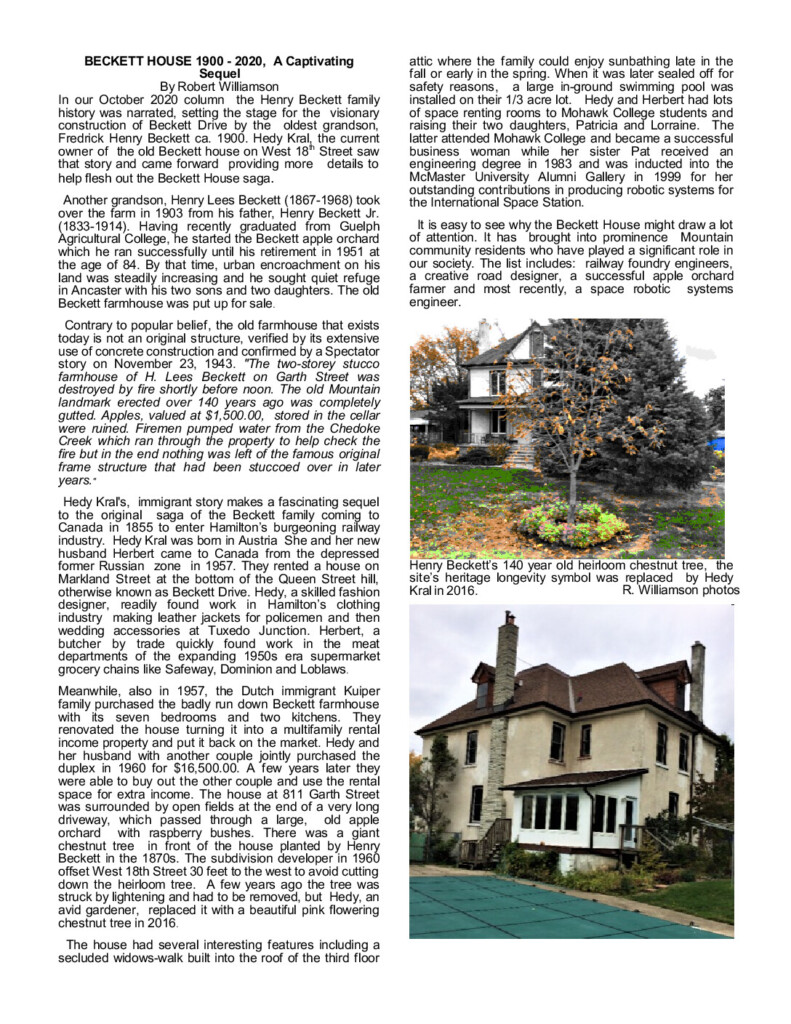 In our October 2020 column the Henry Beckett family history was narrated, setting the stage for the visionary construction of Beckett Drive by the oldest grandson, Fredrick Henry Beckett ca. 1900. Hedy Kral, the current owner of the old Beckett house on West 18th Street saw that story and came forward providing more details to help flesh out the Beckett House saga. …