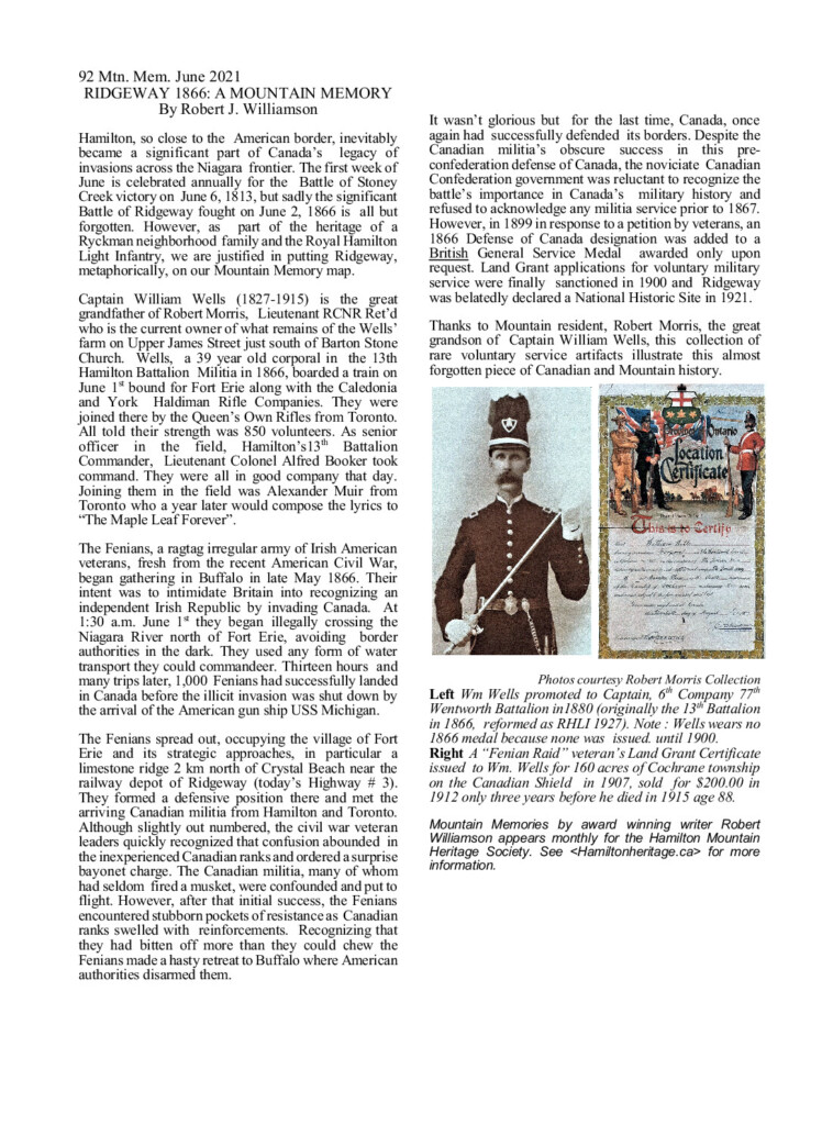 In June, for the 155th anniversary of the Battle of Ridgeway, this heritage column connected Hamilton’s Mountain militia volunteer, Captain William Wells and