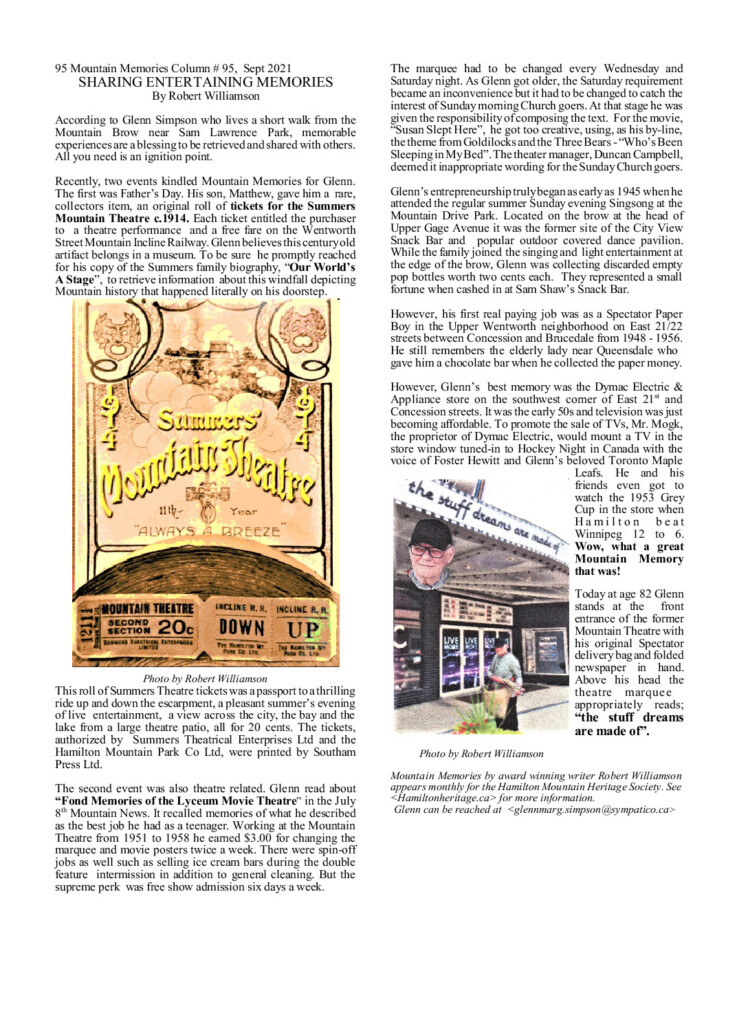 According to Glenn Simpson who lives a short walk from the Mountain Brow near Sam Lawrence Park, memorable experiences are a blessing to be retrieved and shared with others. All you need is an ignition point. …