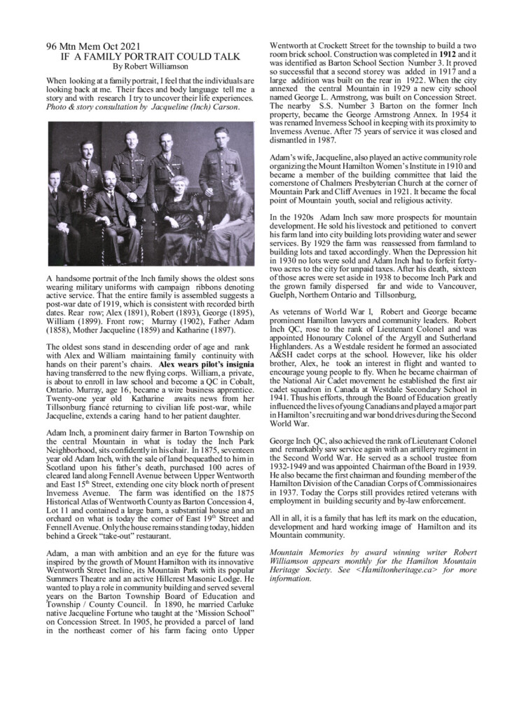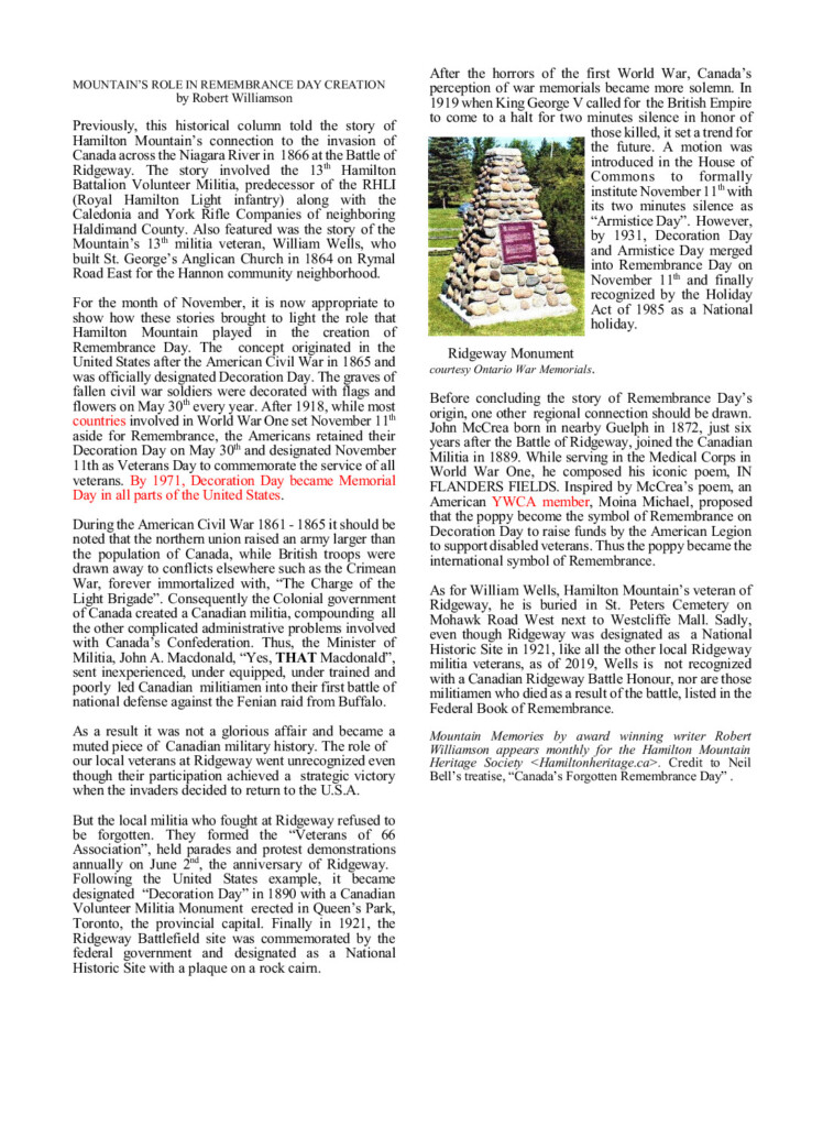 For the month of November, it is now appropriate to show how these stories brought to light the role that Hamilton Mountain played in the creation of Remembrance Day…