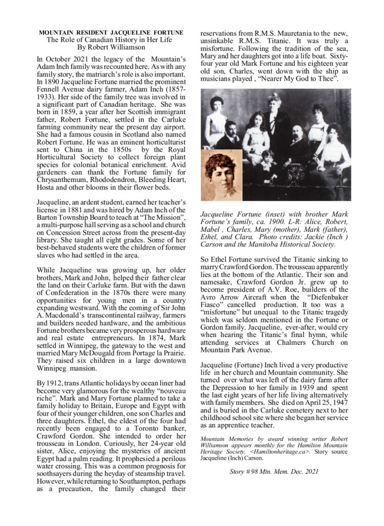 Jacqueline, an ardent student, earned her teacher’s license in 1881 and was hired by Adam Inch of the Barton Township Board to teach at “The Mission”, a multi-purpose hall serving as a school and church on Concession Street across from the present-day library. …